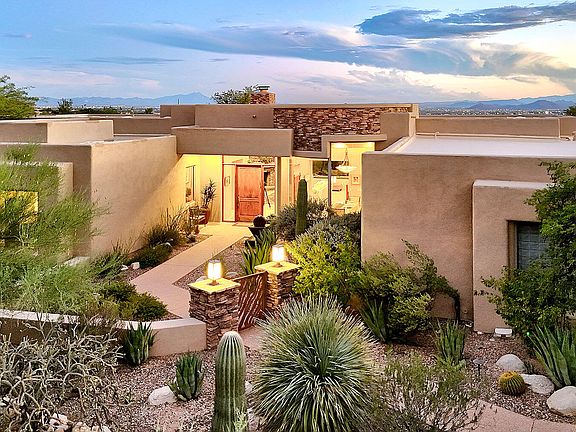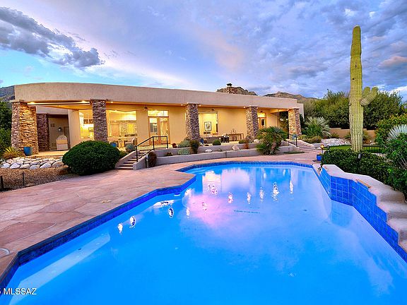 Located in prestigious guard-gated Pima Canyon Estates, this stunning Southwest Contemporary home captures both incredible city lights and dramatic mountain views. Enter through a gated courtyard with a soothing waterfall, and step inside to be greeted by a large picture window framing a majestic saguaro, lush desert landscape, and sweeping vistas. The dining room boasts Catalina Mountain views and a coffered ceiling, while the living room is anchored by a rustic stacked stone fireplace. The gourmet kitchen features a large island, Alder cabinets, quartz counters, KitchenAid and Liebherr appliances, an oversized walk-in pantry and flows seamlessly into the casual dining area with built-in desk and additional cabinetry. The primary suite offers a newly remodeled spa-like bath with two generous walk-in closets, a luxurious soaking tub with private views, and a tiled separate shower. Outdoor living shines with a long covered patio, newly plastered pool, stacked stone fireplace, putting green, and breathtaking views in every direction. Additional highlights include a 3-car garage with coated flooring and extra storage, water softener, central vac, new washer & dryer, and sump pump. Exquisitely maintained yet inviting and comfortable, this home is a true desert retreat.