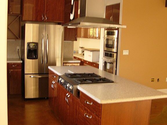All exterior walls are 2x6 studs, not 2x4. Added insulation keeps utility bills to a minimum. Includes built in vacuum system; on-demand hot water (no tanks); special ceiling fans in living area and all three bedrooms; electric rollout patio cover; water mist system at patio; pool with waterfall, glazed tile finish; Two storage sheds in rear yard area; lot separation with 8" decorative concrete block 6' high (no wood fencing); grape vines entire length of wall; battery operated roll up blinds in living area and master suite; thin-twin washer dryer in master bath; built-in central vacuum system with 4 outlets and floor intake. washer/dryer in laundry room on second floor; jacuzzi tub with shower in master bath, and separate stall shower with wall jets; twin sinks; walk in closet. Corian tops in master bath and kitchen; special Venetian cabinets in kitchen and master bath, with special hardware and lifetime warranty. Very special artist designed/finished stained concrete floor on entire ground floor; Brazilian tigerwood on stair and entire second floor. Master suite is on ground floor with exterior sliding door to patio and regular door to jacuzzi area. Specially designed color by color consultant for 3 wall areas in living area, family room and 1/2 bath walls. New furnace/AC installed last month w/10 year warranty. Unit is in closet on main floor hallway (no equipment on roof). Gas fired three way fireplace separating dining area/living area; flat wide white blinds in all windows; special light fixtures throughout house from Furnitalia, wall and hung lights not found anywhere else. Hose bibs on exterior in 5 locations around house, including hot water on hose at garage; specially designed hand rail on stairway, steel tube design finished with automobile paint; steel double gate at side yard for auto access to rear yard area. All gutters from roof drain into underground drains to street, so no roof water drains onto the property. Roof is concrete tile that will last a lifetime; gutters are 6" deep flush, dark brown finish throughout house.