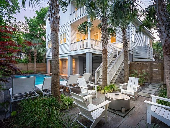 This stunning Isle of Palms beach home, built in 2020, was expertly designed for today's discerning buyer and evokes the true feel of the Lowcountry lifestyle with light-filled living spaces, upscale finishes, large bedroom suites, and a lushly landscaped backyard complete with a private temperature controlled pool. Situated in the residential section of the island, this home offers an ideal location that is just a short walk from the beach, so you can enjoy year-round strolls along the shores of the Atlantic or leisurely beach days in the spring, summer and fall months. You are also within walking distance of restaurants and shops and close to the Isle of Palms Connector for easy access on and off the island. The light-filled home combines classic design elements with an open floor pl, creating a great setup for everyday living or entertaining. The spaces flow effortlessly together and include an entry foyer, large living room, defined dining space, and custom kitchen, all bathed in natural light from large windows and accented by carefully curated finishes. Craftsmanship abounds with details such as White Oak hardwood floors, tall ceilings, designer fixtures, and crown molding, while the custom kitchen features ample cabinet space, quartz counters, stainless steel appliances, tile backsplash, a range hood, and a large center island with seating for four. On the first floor, you'll also find a large front bedroom featuring a wall of custom built-in bookshelves that would feature beautifully as a bedroom or expansive home office, as well as a second guest bedroom that shares a full bath with the front bedroom. Upstairs, the primary bedroom suite awaits, featuring a spacious bedroom, access to a private porch overlooking the tropically landscaped backyard, a generously sized walk-in closet with custom shelving, and an elegantly appointed en suite bath with a marble shower, free-standing soaking tub, and dual sink vanity. Two additional well-sized guest bedrooms, each with their own en suite bath, provide spacious accommodations for family or guests. Outdoors, you'll find plenty of space for relaxation and entertainment. Enjoy a meal al fresco on the covered porch directly off of the kitchen or gather with family and friends on the blue stone patio complete with a fire pit. The private backyard is abundantly landscaped to create a vacation-like feel and features a pool (complete with a heat/cool pump for use year-round), low maintenance ipe decking, a covered patio, and an outdoor shower for quick rinses after your swim in the ocean or pool. Landscape lighting throughout the property, including uplights on the live oak tree in the front, add an extra layer of luminosity at night. The elevated construction of the home also provides a two-car garage plus ample storage space for all your beach equipment, along with an elevator to the interior floors. This home is a perfect combination of style, comfort, and location, making it an ideal beach retreat or primary residence.