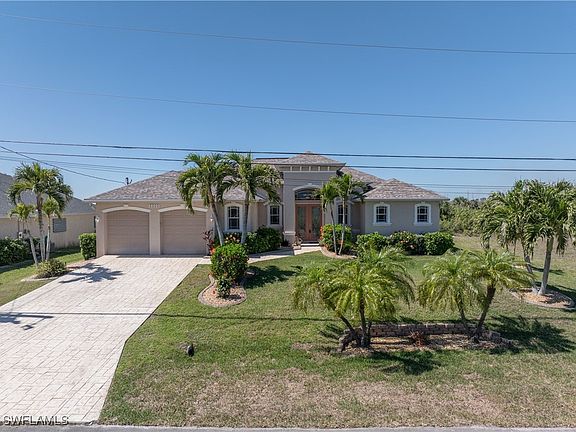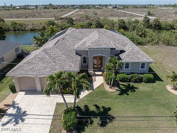 Can you imagine yourself living on a canal in a gorgeous home with a pool and 2657 square foot under air in Sunny Cape Coral, Florida? Well, here is your opportunity with no chance of snow! Put down the shovel and see what this home has to offer. It's sits high and dry, not in a flood zone. City utilities are in but not yet hooked up. It will be partially furnished if you prefer. You will fall in love as you walk through the glass double door entry and see the pool and canal view! Work from home in the office/flex space and serve dinner in the formal dining after relaxing in the living room overlooking the pool. The large kitchen has plenty of storage and prep area. Perfect for entertaining, you will be able to chat and still enjoy guests while in the kitchen. Easy access to the lanai for serving through the sliding glass doors.The great room is HUGE! It also overlooks the screened pool area. Two large windows for natural light and beautiful coffered ceiling! All rooms have high ceilings and 8 ft doors. And to top it off, there is a air conditioned storage room with access from inside the home and the garage. It is truly amazing with shelving in place and a window for natural light. This is something you just do not see on a regular basis. The guest suite has 2 large bedrooms and a bath. The master retreat is large with sliders to the lanai for a late swim. The bath features a soaking tub, walk in shower, dual sinks and a private water closet. The spectacular screened pool area is ready for entertaining! Enjoy the warm days laying in the solar heated pool on a raft. Sorry, it does not come with a pool boy but it does have a dedicated pool bath! Just outside the door is a grilling area and stairway to the dock! Cruise around to the many canals and lakes. Bring your fishing poles, You may catch a bass or two. This home is not in a flood zone. Roof/2020, A/C/2024, Solar pool heat/2022, Well pump/2025, Upgraded Water system/2025, Upgraded sprinkler system/2025, new screens/2025, New pool deck/2025, Exterior paint/2019, Small bath/new toilet. Seller is offering the generator with the sale of the home. This home is move in ready and close to everything Cape Coral has to offer. Just a quick ride to awesome beaches north and south of us! You will not be disappointed!