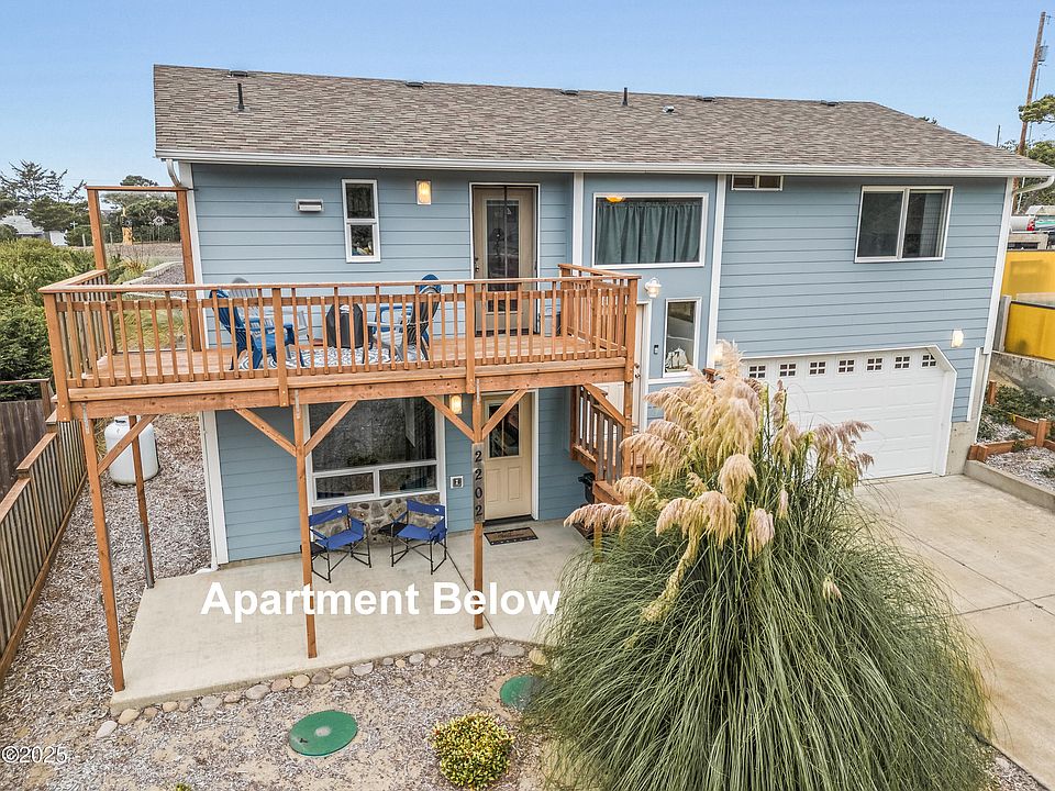 LOOK NO FURTHER FOR YOUR COASTAL SANCTUARY! Fully appointed no-step access to apartment/guest quarters below with LR, BR, Kit, Bath, W/D) Discover this exquisite, 2020-built 3-bedroom, 3-bathroom home nestled in a wonderful neighborhood. With 1856 SF of luxurious living space, open-concept design that invites natural light to flow through. The spacious kitchen dazzles with granite countertops, while the gorgeous tile work throughout the home adds a touch of elegance and coastal flair. Enjoy delightful ocean views from the upper deck and relax on one of two patios, perfect for soaking up the beach living vibe. Distant ocean views, forest and mountain views from the deck. This home also features an xtra deep 2-car garage with a shop area.