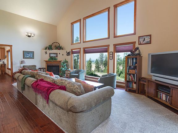Stunning 2750 sf home set on 6 acres over looking 2 valleys. Country living but only 35 minutes from downtown Spokane. Incredible views out every window letting in lots of natural light. Enjoy entertaining in the spacious open concept house. Large bedrooms, cathedral ceilings, 2 living rooms, an office, covered decks, plus 1100 sf attached garage/shop.