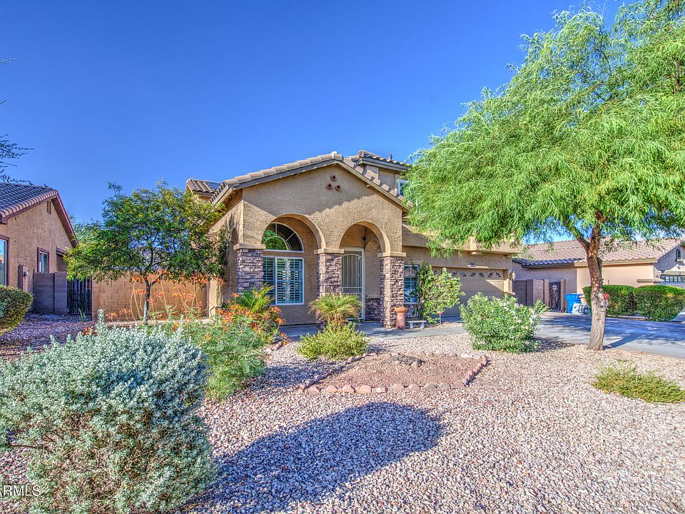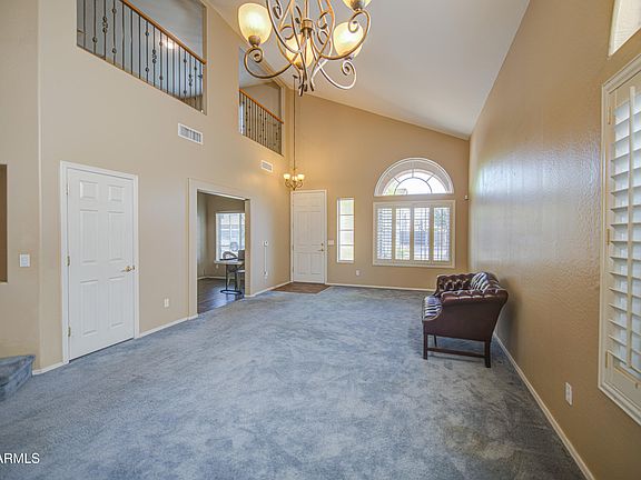 Pride of ownership is what you see when you drive into this quiet neighborhood. This home has RV gate, pavers in the driveway leading to the back yard. 2,762 sq ft home featuring soaring vaulted ceilings and an amazing backyard. All living areas are very spacious, with loft, downstairs office with walk-in closet only needing door to be a 5th bedroom, Kitchen has granite countertops, island, new Samsung refrigerator, newer faucet, lots of cabinets and counter space. Lot's of lighting throughout home. Plantation shutters in the front windows & 3 new windows. Wide stairway with custom railing. Spacious master bedroom has custom window covering, bath has separate tub/shower with a large walk-in closet. Large laundry has a supply closet. 2 New Carrier Ac units and water heater installed 2022 1-2 years left on ac maintenance service plan which will be transferable. Energy efficient home with a solar system, payment of $176 for the next 2.5 years and $117 for the following 10yr. Garage has epoxy flooring. You will love this amazing backyard and extended patio, pavers throughout for low maintenance, adorable landscape design, mature citrus/shade trees, fire pit, large barbecue area with shade, above ground swimming pool only 1 year old, 1 shed and a storage/workshop shed with power. Great location with new Costco, Verrado Marketplace coming soon, public library, Walmart, Lowes, shopping centers, Skyline Park, a beautiful hiking area.This home is well taken care of. ready to for the new owner to put in personal touches. Great bones!