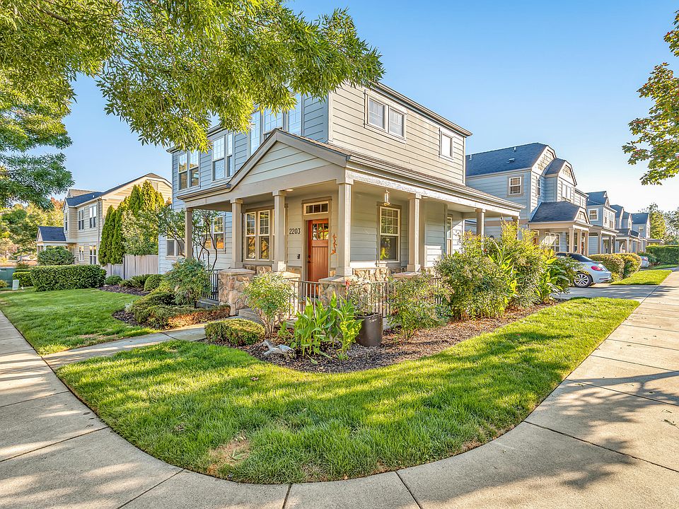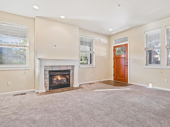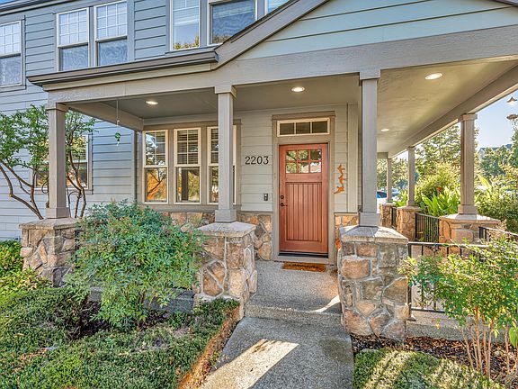 Desirable corner townhome with tranquil outdoor entertainment area, centrally located near grocery shopping, Ashland Family YMCA, and future site of East Main Park proposed by City of Ashland! Wrap-around covered front porch with pebbled concrete patio, high interior ceilings, slate entry, gas fireplace, kitchen and dining area with engineered oak floors, Corian dining counter, half bath with pedestal sink, and one-car garage on main level. Three bedrooms on upper level including primary with walk-in closet and full ensuite bathroom, guest bedroom with walk-in closet, full guest bathroom with tub/shower, hall laundry closet, and third bedroom with closet. Private fenced yard with hot tub, natural gas firepit, raised garden bed, and pebbled concrete patio. Association dues of $100 per month cover landscaping maintenance, irrigation, along with upgrades of front yard and common areas. New dual-zoned heating and air conditioning system installed 2017. Inquire for additional documentation!