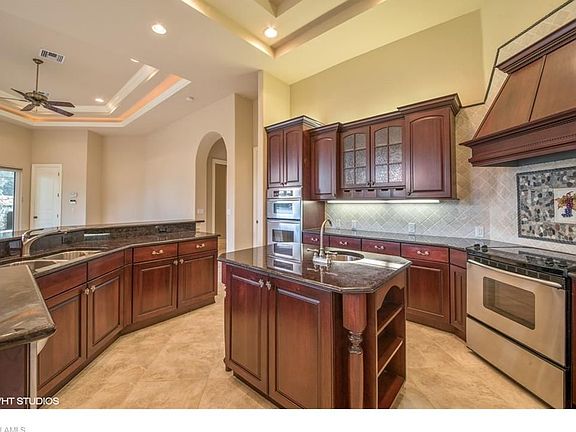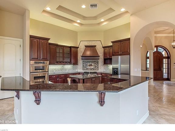 H.10097 - Elegant lakefront home with soaring ceilings and upscale finishes throughout, nestled on a quiet cul-de-sac. Crown molding, tray ceilings, beautiful floors, walk in pantry, granite and gorgeous cabinetry are just a few of the custom features. The designer kitchen provides an elegant, functional work space for the entertainer in all of us. The master bedroom encompasses a private sitting room, large walk in closet with built-in cabinetry and master bath with dual vanities, jetted tub and large walk in shower. Two additional bedrooms, both with en suite bath, are located on the other side of the home providing privacy to family members or guests. The outdoor living area is designed to take advantage of expansive lake views. Outside entertaining could not be more fun with the sparkling pool & swim-up waterfall bar inside the stone grotto. There is also a walk in entrance in the back. The grandchildren will be entertained for hours! The lanai embodies Florida living at its best, with the feel of a tropical resort. It also incorporates a large undercover area providing the perfect venue for outdoor entertaining or simply relaxing after a round of golf or enjoying a good book.