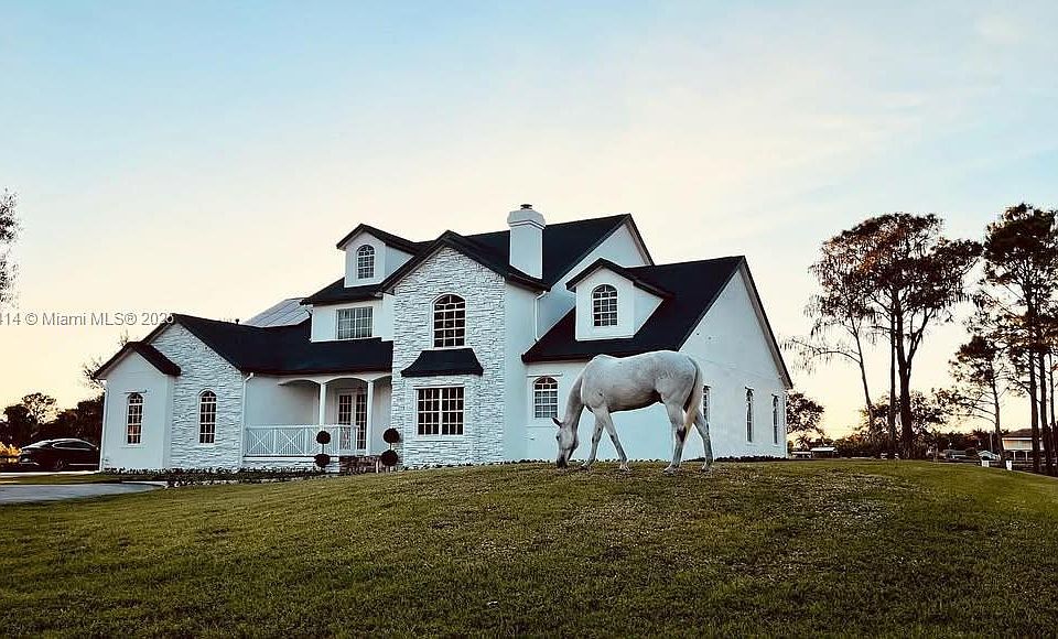 Exquisite 5-acre equestrian estate in gated Deer Run, minutes from Wellington’s top dressage venues. Renovated in 2021 & 2023 with elegant French Country design, this 5BR + den, 3.5BA, 4,334 sqft home offers refined living with formal dining, loft, and first-floor master suite. The 5-stall concrete barn features soft stall flooring, auto waterers, A/C tack & feed rooms, groom’s quarters, and 1/1 apartment. Ride daily in your Olympic-size fiber arena with irrigation and drainage, 8 lush paddocks, private trail, and dual gated entries. New roof, $150K solar system, 2-car garage, barn parking. Zoned Ag.