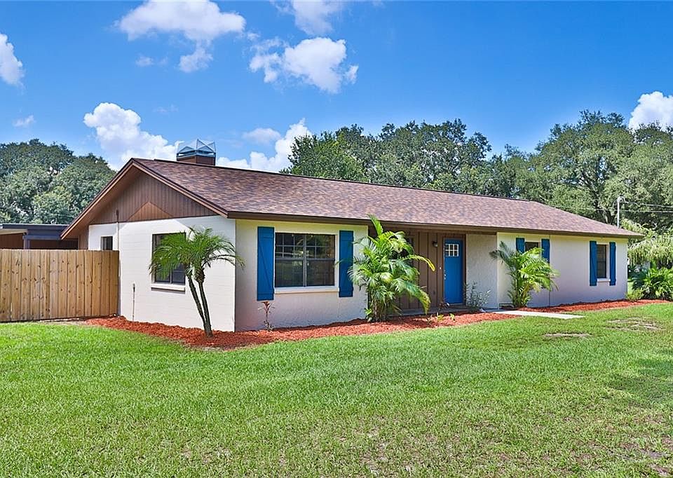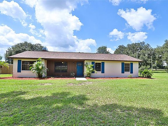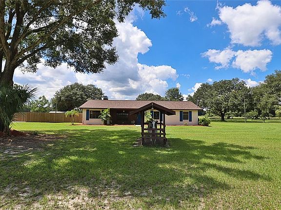 Just minutes from everything, you'll find this cozy country retreat situated on a full acre in the Newsome and Randall school district. NO HOA, NO CDD and NO WATER BILL! Cows (and an occasional deer or two!) grazing and acres of pastureland greet you as you approach this Ranch-style home with charming curb appeal. Enter to find an open floor plan living area featuring vaulted ceilings, cedar accents & built-ins, and a wood-burning fireplace. The kitchen showcases wood cabinets and granite countertops. French doors lead to the expansive family space with views of the screened pool and large deck...perfect for family gatherings and entertaining. There's a bonus room that could be used for a 4th bedroom, office space, den, etc. as well as an enclosed single-car garage-sized room that would be the perfect man-cave, she-shed or playhouse! Fenced yard includes a separate storage shed, and a huge concrete parking pad (big enough for your RV and/or boat!) which also leads to a 2-car enclosed carport. This home has wood-look vinyl and ceramic floors, an inside laundry plus a BRAND NEW ROOF, NEW POOL CAGE and FRESH INTERIOR & EXTERIOR PAINT. Don't miss this country charmer. It won't last long.
