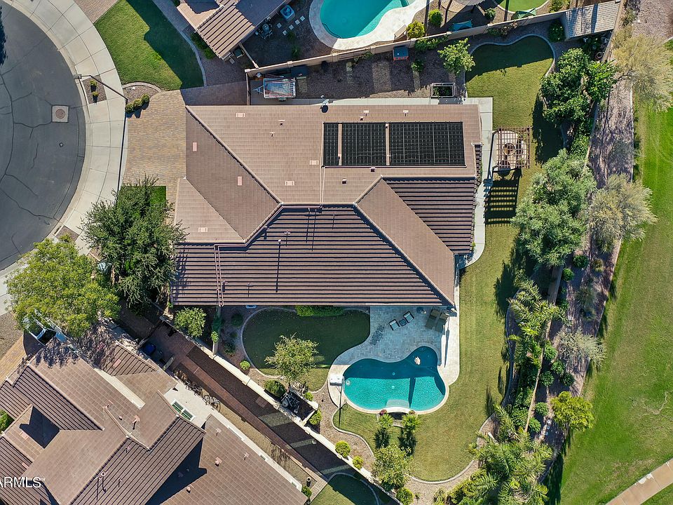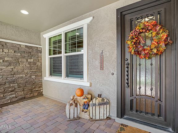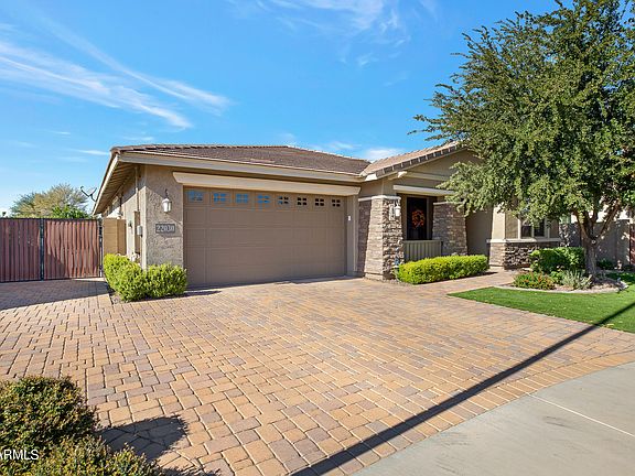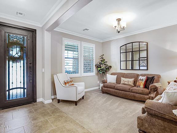 Incredible home on one of the best lots in all of Charleston Estates in Queen Creek! 3 car tandem garage with fully paved driveway and RV gate for plenty of parking. Beautiful custom iron door greets you under the covered front patio. Freshly painted inside and out this immaculate home shows like a model home. Plantation shutters and crown molding throughout with tile in all the right places. Gorgeous chefs kitchen with gas cooktop, double ovens and huge kitchen island for the whole family. Tons of extra cabinets and storage along with a walk-in pantry. Big laundry room with custom built cabinets and study area. Master bedroom is a dream with his and hers closets, dual vanities, large soaking tub and walk-in shower. Step outside to your own oasis with the sparkling pebble tec pool and lush green grass. This backyard is amazing with all types of mature trees, including citrus, apple and even grape vines! Owned solar for the pool equipment with in ground cleaning system. Travertine pavers, pergola with water feature and plenty of more room to play. This is an entertainers dream yard, come see this one for yourself today!