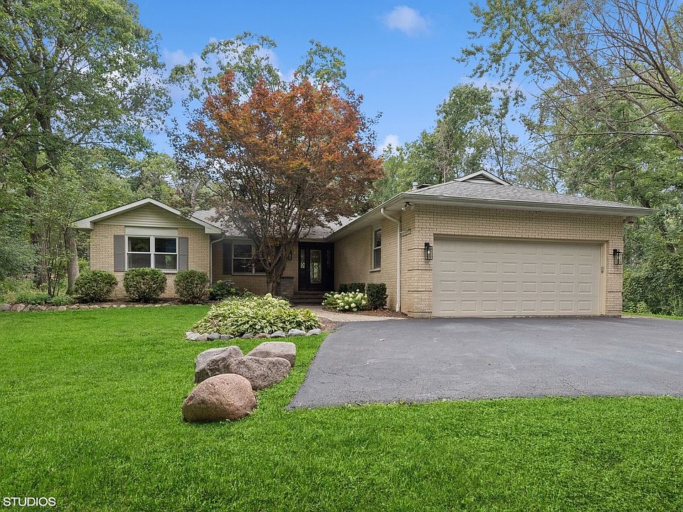 This tricked-out ranch on quiet wooded lot will have you at "HELLO." The epitome of one-level living features hardwood floors, rich trim, white kitchen, two fireplaces, updated baths, fresh decor, modern light fixtures, and MANY recent updates including furnace, water filtration system, water heater, sump pump + backup, two skylights, Andersen doors to deck & garage, garage door and opener, bedroom carpet, and deck railing/ steps/ gate/stain. Light and bright kitchen with white Shaker cabinetry with sleek nickel hardware, task lighting, glass tile backsplash, newer stainless LG appliances including French door refrigerator w/ door dispenser and electric range w/ two ovens, stainless farm sink with gooseneck faucet and wide window overlooking wooded grounds, quartz counters, recessed lights, square dove gray island with seating and spacious dining area with new Andersen doors to massive deck. Convenient main level laundry off kitchen with cabinets, shelves, utility tub and stainless LG washer and dryer. White brick fireplace with raised limestone hearth in adjacent family room. Natural light and even more space to spread out defines the immense living room. Dining room with new urban chic iron light fixture, crown molding and French door to kitchen. Leaded glass entry door with sidelights leads to foyer with modern lighting, deep coat closet, double French doors to family room and wide entry to study with built-in bookcases and cabinets, 2" wood blinds, custom aquarium and crown trim. Completely updated hall bath with double vanity with espresso cabinetry and granite top, linen shade sconces, new skylight, oversized shower, mosaic border and stone tile on wall and shower surround; and rain shower, handheld spray, toiletry niche, and custom glass enclosure in oversized shower. The owners' suite provides a dreamy retreat with five big windows for views of private wooded grounds, full wall of floor-to-ceiling custom boutique-style closets with drawers, shelving & lighting, spa-inspired bath with new skylight, espresso cabinetry, granite top with two rectangular sinks and polished nickel faucets, drum shade sconces, white soaking tub, and shower with clear glass enclosure, rain shower, handheld spray and toiletry niche, stone tile floor and wall tile with mosaic border an white Kohler commode, plus double door wall closet. Bedrooms 2 & 3 have brand-new carpet, fresh decor, generous closets and plenty of natural light. Head towards the oversized two-car garage and you will see the back entry hall that leads to the fabulous finished basement. You won't run out of things to do in this entertainment mecca. Full wall stacked stone fireplace, bar with seating for 6, sink and beverage coolers, stone finish tile floor, half bath with vessel sink, fireplace, pool table, ping pong table, leather couch, bar stools, and TV (YES! They all stay!) and millwork encased columns. Unfinished mechanical room provides great storage. All this nestled in iconic Pine Valley with easy access to shopping, train, restaurants, health care, theaters, access roads, historic Long Grove, parks and fitness clubs. Top-rated schools: Isaac Fox Elementary School, Middle School South and Lake Zurich High School.