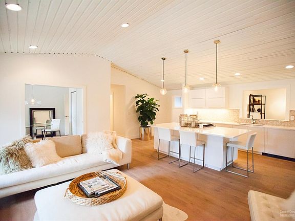 Stunning 3200 sqft mid-century modern renovation by Pringle Designs features an open concept great room and 4 bedrooms, 2 with en suite baths. Vaulted ceilings, barn doors and white painted shiplap preserve the home's original character. High end finishes include wide plank hardwood flooring, slab quartz countertops and limestone detail. A large daylight basement has sliding doors leading to a private patio. The 1/3 acre is professionally landscaped with parking for oversized vehicles. No monthly HOA fees!