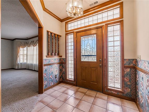 entertaining, complemented by two welcoming living areas. The 3-car garage, utility with pantry, auxiliary kitchen with second cooking range/hood & abundant storage enhance practicality. Located near Tyson Recreational Complex, Arvest Ballpark & Arkansas Children's NW Hospital, it seamlessly blends convenience & community. Built-ins including lighted display shelves & glass door cabinets add a touch of sophistication to the residence. Additional highlights include 2 wet bars, under cabinet & accent lighting, brick hearth, double-sided fireplace, freestanding gas fireplace stove, stained wood crown molding, chair rails, gutters, storm doors & bay window. The home further boasts an inviting front porch & covered back patio for outdoor living, plus a corner lot with side entry garage, combining comfort with functional design.