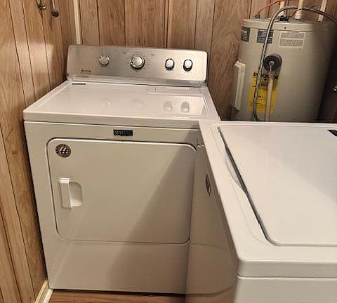 The open layout features newer flooring throughout and a modern kitchen with updated appliances—refrigerator, stove, microwave, dishwasher, washer, and dryer—all conveying. Both bathrooms have been thoughtfully renovated: one offers a luxurious walk-in shower and the other a classic claw-foot soaking tub.