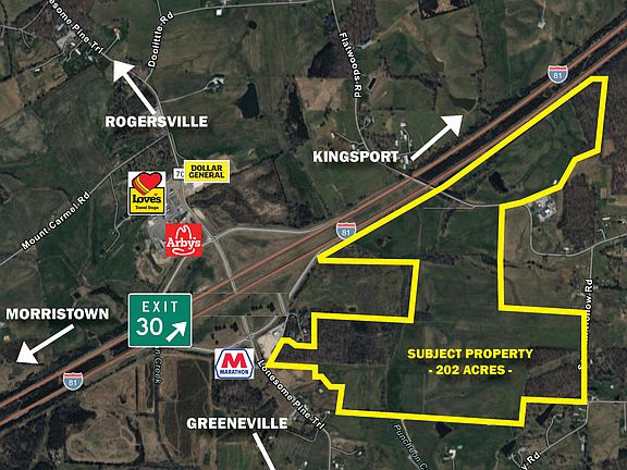 This is a beautiful 202-acre farm consisting of five tax parcels that sits right off I-81 at exit 30 in Mosheim, TN. This is the first time this family property has been offered in its entirety. The rolling land is mostly cleared, has a pond and seasonal creek, a hay barn and has nearly 3,500' of combined road frontage on McNeese Lane, Lonesome Pine Trail, Sawmill Hollow Road and Flatwoods Road. Much of the property is visible from I-81.