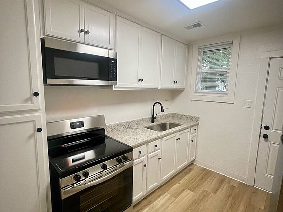 The updated kitchen is thoughtfully designed with granite countertops for generous prep space, stainless steel appliances for a polished look, and refreshed cabinetry for both storage and style. Together, these finishes create a clean and modern cooking space.