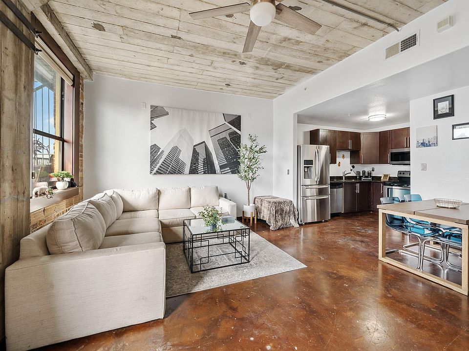 Modern 4th-Floor condo in EaDo with stunning Downtown views. Welcome to this stylish condo located just three blocks east of Downtown Houston in this vibrant district. Enjoy sweeping views of the George R Brown convention center and Daikin Park, with Shell Energy Stadium only two blocks away. Also located withing walking distance of local eateries and night life. This condo offers the perfect blend of city living and modern comfort. This building features a rooftop deck where you can take in the skyline and watch fireworks after baseball games and 4th of July. The second floor offers a spacious patio with an outdoor kitchen- perfect for entertaining or relaxing with friends. Additional amenities include a garage parking lot with and access to a fitness room. Internet access is also included. Please do not let this one pass you by.