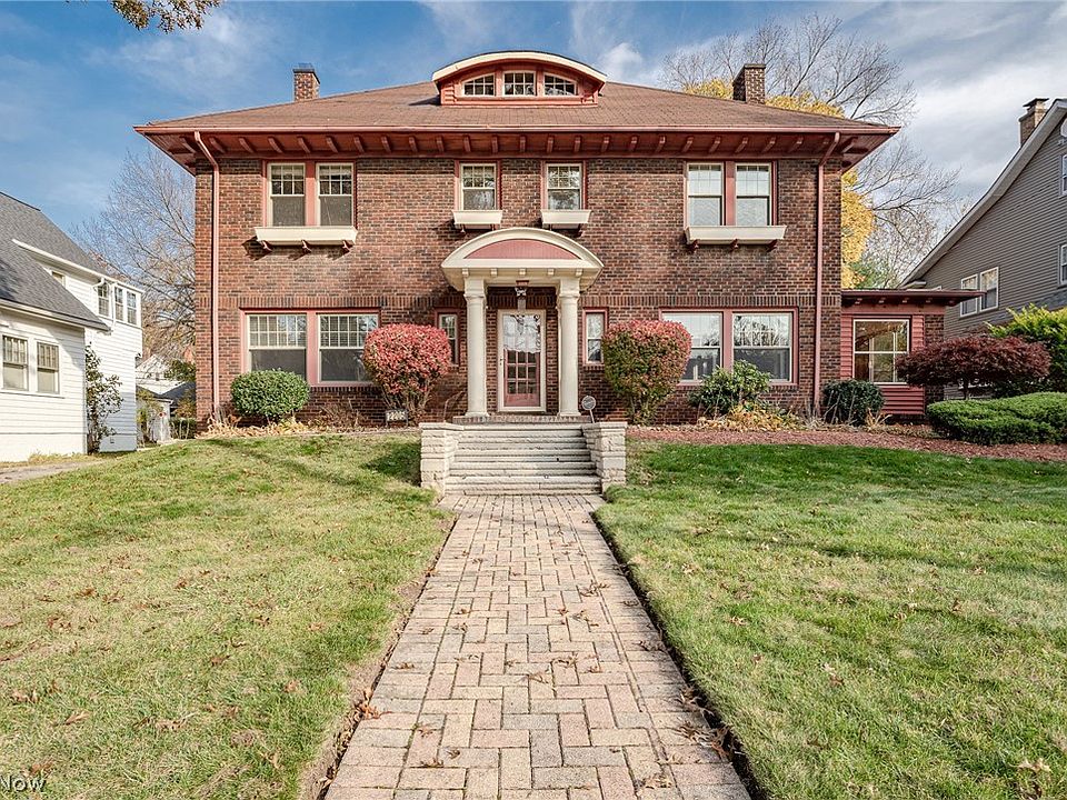 Wow! Great opportunity for a charming all-brick colonial in a prime Cleveland Heights location! This lovely home features spacious living areas, gleaming hardwood floors, a stunning great room with a vaulted ceiling, and a delightful mix of original character with modern amenities. The front door enters into a welcoming foyer with an office to your left and the living room to your right. The spacious living room features an elegant wood-burning fireplace and access to a sunny enclosed porch. You will love the great room which boasts a soaring vaulted ceiling, fresh carpet, and a spiral staircase to the second floor loft. The formal dining room connects the living room to the kitchen. Here you will find granite countertops, plenty of cabinet space, newer appliances, and a morning room. A convenient half bath complete the first floor. Upstairs, there are 5 bedrooms including the generous owner's suite with a dressing room and an ensuite full bath. The third floor includes 2 bonus rooms,