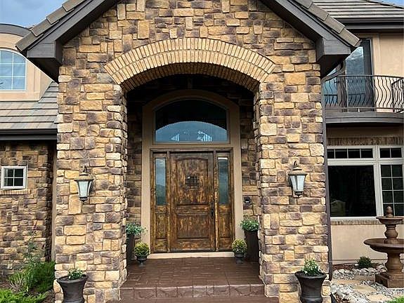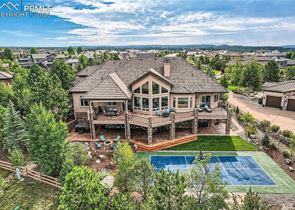 Discover this former Parade winner within the exclusive gated community of Calistoga in Flying Horse! This captivating, fully customized 2-story home, once the builder’s personal residence, offers a feast for the senses, including a custom PICKLEBALL court! Enjoy unobstructed panoramic views of majestic Pikes Peak, Front Range, and city skyline, all complemented by a spacious walk-out basement perfect for entertainment. Extra insulation throughout providing excellent weather and noise reduction. Nestled in a peaceful cul-de-sac on half an acre, this 3-level gem features a TCS ProCushion pickleball court, meticulous landscaping, waterfall features/creeks in the rear, mature trees, and hot tub. Inside, four spacious bedrooms (flex room for optional 5th BR) five bathrooms, two offices on the main floor with mtn views. The master suite boasts radiant floor heating, a luxurious steam shower, oversized his-and-hers closets, and laundry hookups for added convenience. The main living area features expansive vaulted ceilings, seamlessly connecting to an enormous wrap-around stamped concrete deck, partially covered and equipped with a built-in grill. The kitchen, living room, and dining area harmoniously flow together, showcasing wood floors, high-end appliances, large farm sink, beautiful white quartzite surfaces, generous room sizes, solid Alder 8ft doors, custom lighting and a host of other exceptional details. The basement boasts high ceilings, a large custom wet bar, wine cellar, sleek concrete flooring, and an impressive oversized theater room complete with top-tier equipment, including a 4K projector and a premium surround sound system. The upper level provides a spacious loft "flex" area. Experience the convenience of a "Smart House," seamlessly controlled via the fully updated (2020) Control 4 system, managing security cameras, intercom, lighting, garage doors, and indoor/outdoor speakers directly from your smartphone. Full house alarm system for additional safety.