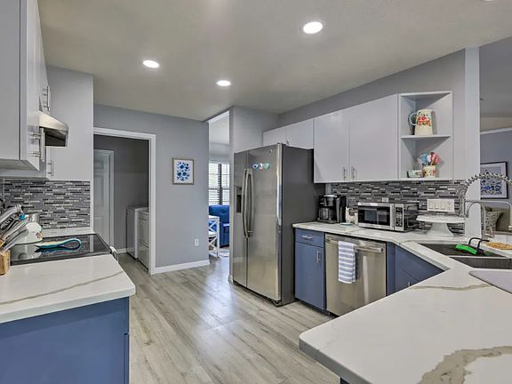 Screen porchLush green foliageIn-unit laundrySky blue stucco exteriorSmart tvs