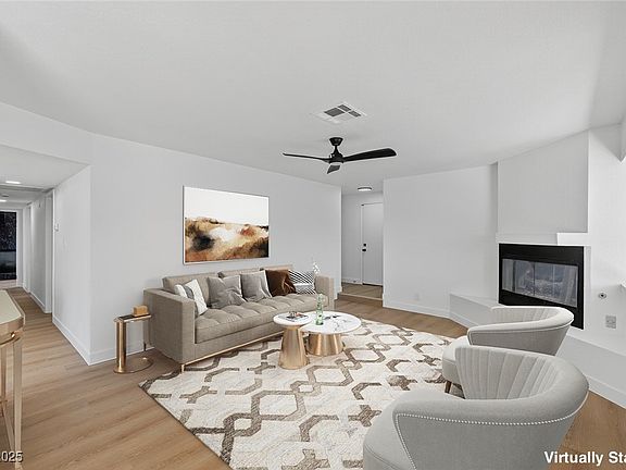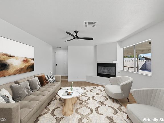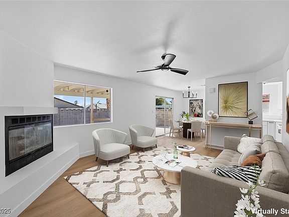 Seller is helping with your closing costs, making this home even more affordable! The home features four spacious rooms with light wood-style flooring throughout, creating a warm and cohesive aesthetic. The living room is anchored by a striking multi-toned fireplace, perfect for cozy evenings, while a second fireplace in the dining area adds ambiance and elegance to gatherings. The open-concept layout flows seamlessly from the living space to the dining area and into a remodeled kitchen, complete with open shelving, stainless steel appliances, and white cabinetry for a clean, contemporary look. The home includes two updated bathrooms, each featuring a modern vanity, shower, and sleek fixtures. Additional highlights include ample closet space, a private backyard, and a welcoming front facade with driveway access. DON'T MISS OUT!