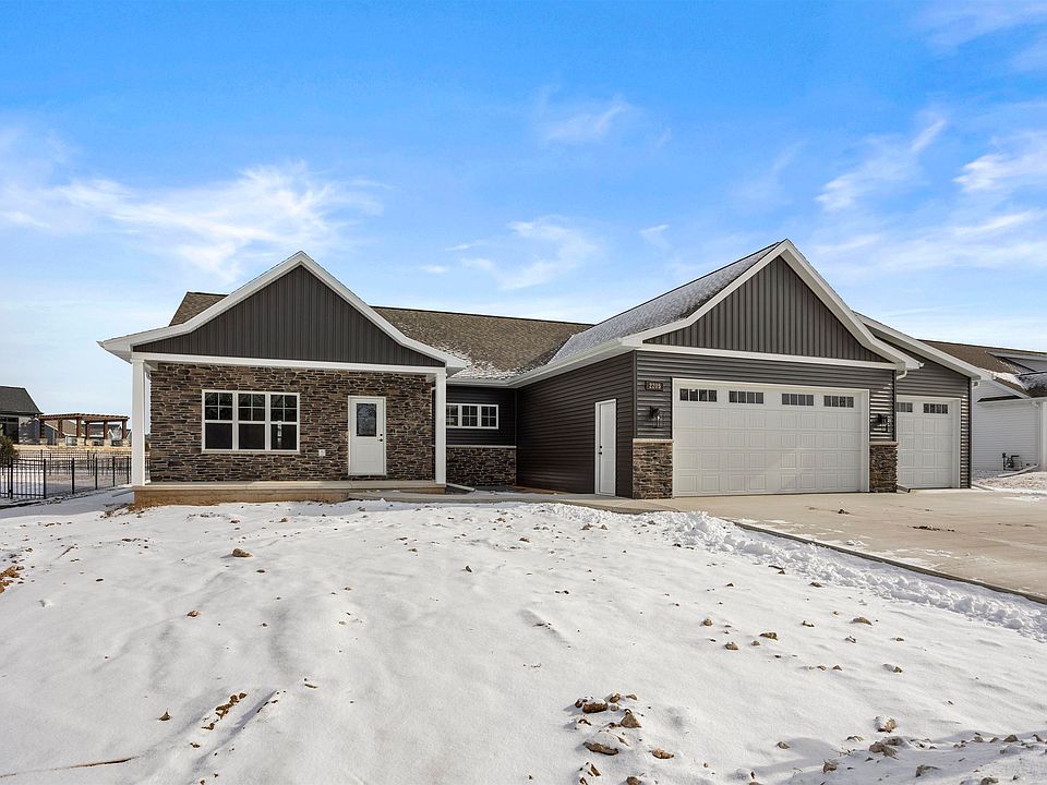 Open concept ranch split bedroom plan lots of amenities. Huge kitchen with walk-in pantry, center island, tons of cabinets with granite countertops & full appliance package. Living room with gas fireplace and dining area looking out over the backyard from the covered patio. Primary bedroom with full bath including double sink vanity, walk-in tile shower and super-sized walk-in closet. A pair of bedrooms & full bath complete the far end of the home. Mudroom with locker area, drop station and laundry room. Downstairs offers egress windows for future finishing and is stubbed for a full bath still allowing plenty of storage space. Large 3 car garage with basement access. Large lot and convenient location
