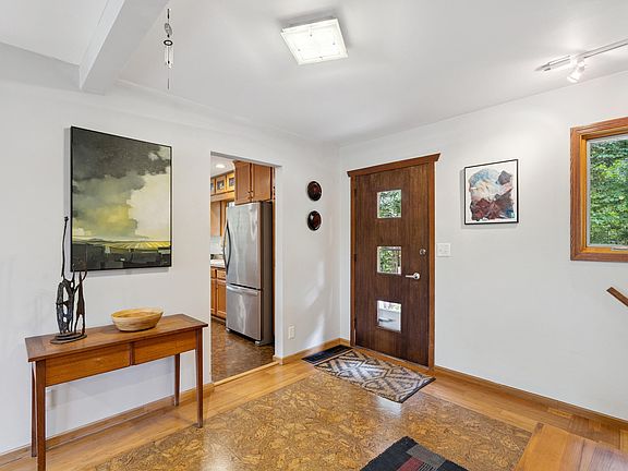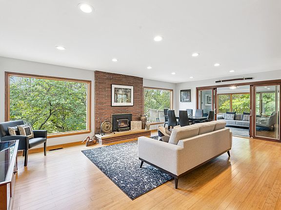 With its distinct mid-century modern influence, this home's architecture blends timeless style with modern updates. Cork and bamboo flooring flow throughout the main level, while expansive windows in every bedroom and living area invite natural light and frame stunning wooded views across the 3.28-acre property.