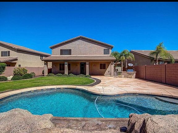 This property offers an impeccably maintained, well appointed home and a resort style backyard perfect for family and entertaining. The main floor features a large formal living and dining space with soaring ceilings, a beautiful kitchen with granite and stainless appliances, large family room and a bedroom and full bath. Upstairs you will find the spacious master suite complete with separate shower and tub, double vanity and walk-in closet; a loft and 2 additional bedrooms. The beautiful backyard is the perfect place to enjoy the outdoors all year round with sparkling pool & water feature, large grassy area, extended stamped concrete decking, covered patio and built-in BBQ. Additional features include plantation shutters & garage w/ epoxy floors and built-in cabinets, new appliances, Accent wall and modern vinyl flooring. This property has solar.