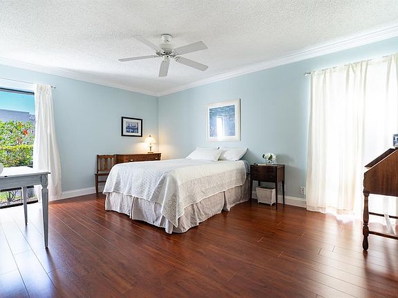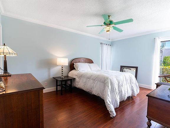 This large 1st floor condo is nestled in the prestigious Boca Del Mar area, offering an unparalleled full vista of the gazebo at Placido Public Park. Step out your back door for leisurely strolls around the park's magnificent lake. This home features a spacious kitchen that opens to a large living area. It boasts 3 generous walk-in closets and elegant laminate wood flooring throughout. An extra storage closet outside the patio adds convenience for your belongings. Your assigned parking spot is conveniently located just outside your door. The building has been recently painted, & the roof is 2 years old. As part of a 55+ community, residents enjoy access to 2 heated pools, BBQ, and a charming clubhouse. Minimum credit 650 per Condo Assoc.