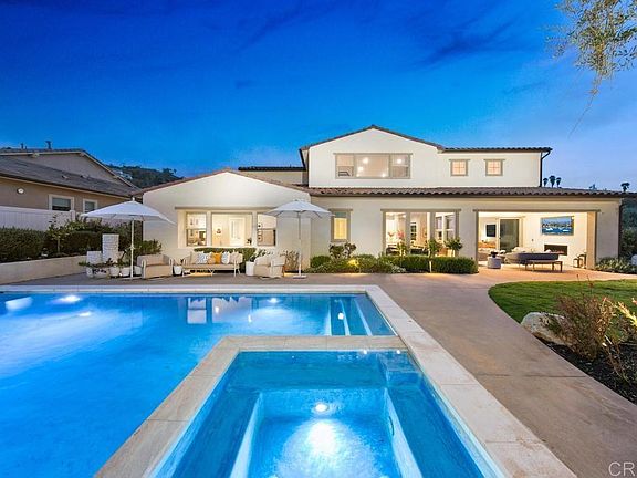 Step into a realm where curated luxury meets the serene, sun-drenched ambiance of this exquisite corner lot home in Harmony Grove Village. This residence is not just a home; it's an immersive lifestyle experience, meticulously crafted for those with discerning tastes. Over $300,000 in bespoke enhancements have transformed this property into a haven of refined elegance, where every detail resonates with sophisticated living. What sets this home apart are the stunning Spanish Olive Trees from a rare grove that anchor the landscape with timeless elegance. Five mature Manzanillo olive trees, each over 80 years old, were originally cultivated in Sonoma Valley and carefully transported into place. These majestic specimens evoke the charm of a Mediterranean estate, with sculptural trunks and a silvery canopy that catches the light beautifully, day or night. These opulent olive trees provide not just shade and serenity but also a sense of rooted history and effortless luxury rarely found in Southern California homes—a true signature feature of the grounds. This exquisite home features four bedrooms and four and a half baths, including a two fully en-suite bedroom on the main floor which includes the Primary Suite, offering unparalleled convenience and privacy for guests or multi-generational living. Inside, the atmosphere shifts to one of sophisticated intimacy. The elegant library, with its custom-crafted built-in bookcase and fireplace feature wall, serves as an architectural centerpiece designed for both beauty and function. Framed by rich, deep-toned walls, the light gray millwork exudes timeless sophistication, perfectly showcasing an expansive collection of books, décor, and art objects. Symmetrical shelving offers ample space, while a charming ladder enhances accessibility. At the heart of this refined space, a fireplace anchors the room, topped by a gallery-lit art niche that draws the eye upward, creating a curated, gallery-like ambiance. Hidden cabinetry below provides seamless storage, enhancing the room’s clean, luxurious aesthetic. Whether entertaining or unwinding, this intimate space is a sanctuary of style—ideal for quiet nights or refined gatherings. Beneath your feet, chalet white oak herringbone floors flow seamlessly throughout the main living area. The home features a spacious loft with an open wall that overlooks the lower level. The master bedroom, also on the main floor, boasts two closets and lovely views of the backyard. The dedicated dining room offers a picturesque view of the beautifully landscaped outdoor space. The huge center island, topped with white quartz, serves as the heart of this open floor plan. Step outside to the covered loggia with a fireplace that leads to a resort-style backyard oasis. The recently added pool and spa, a shimmering expanse of azure, are framed by olive and lemon trees, complemented by a cascading water feature. This private escape invites you to slow down and bask in serenity. Custom porch swings, suspended by nautical ropes, sway gently in the breeze, inviting moments of quiet reflection. Raised garden beds, bursting with vibrant blooms, add a touch of organic beauty and functionality. Enjoy the added benefit of fully paid solar panels, ensuring energy efficiency and sustainability.