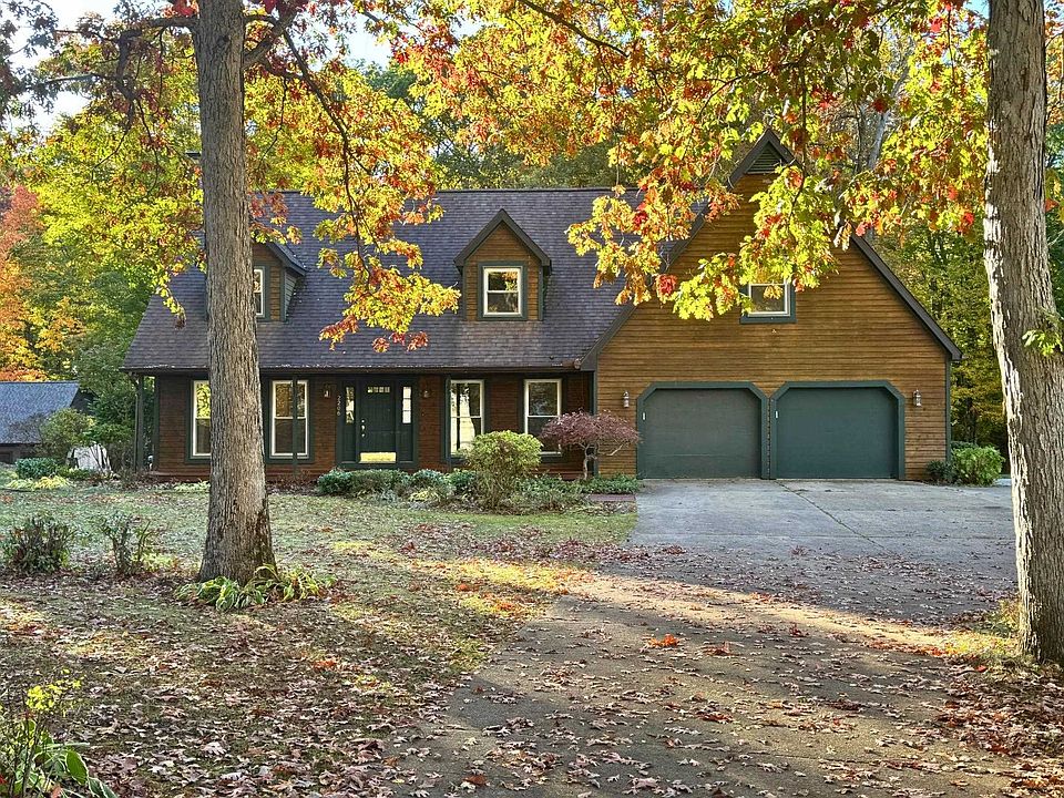 Nestled among the trees with beautifully designed landscaping, this custom-built cedar Cape Cod offers the perfect blend of comfort, charm, and craftsmanship. Large 3-bedroom, 3-bath home features a dynamic primary suite complete with a custom bathroom, fireplace, kitchenette, and private balcony overlooking the multi-level deck — your personal retreat in the treetops. Gorgeous hardwood flooring, cathedral ceiling and gas log fireplace in the living room. The formal dining room and custom kitchen with a center island, spacious pantry, and stunning brick floors create an inviting space for gatherings and everyday living. 2nd bedroom is spacious with a walk-in closet and full bathroom! Enjoy the convenience of a second-floor laundry, or easily convert to a first-floor laundry if you choose. After a busy day, unwind in the perfectly placed hot tub surrounded by nature. Additional highlights include a whole-house generator, updated: windows, furnace, central air, a radon remediation system, lawn sprinkler, circle driveway and so much more! You'll love the oversized attached 2 car garage plus a custom built 40' x 32' bonus garage featuring a camper-sized door, ideal for storing all your toys and tools. You can park up to 6 vehicles in this amazing space! Don’t wait, this Woodside Hills gem won’t last long!