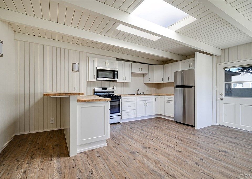 Studio Apartment is approximately 780sqft of open floor plan. It is an excellent choice for someone who appreciates their own unconfined space, a minimalist lifestyle & no interior elevation changes all while being bathed in natural light from large, plentiful windows & a kitchen skylight. While there is a wall of bookshelves in main living area and the perfect spot for a TV, it will require creativity w/ alternative storage solutions like garment racks and/or wardrobes. Discreetly nestled in the back, Studio 'A', has it's own patio area behind a gate and can be dressed up w/ a table & chairs for relaxing outside or eating Alfresco. Butcher block counters contrast artic white cabinetry. The studio comes with a bath w/ a tiled walk-in shower. This studio comes with a refrigerator, microwave, stove & Euro-style combo Washer/Dryer discretely located in its own closet. Zonal A/C unit & overhead fan light keeps the air moving and the room lit. The kitchen has ample storage a breakfast/wine bar and enough room for a table for 4. No carpet anywhere and a creative open space. This is an attached unit to the main house but has it's own entry and outdoor parking spot behind a manually opened roller gate. Close to public transportation, CSULB, Starbucks, Target and Trader Joes. Quiet, relaxing and shaded by a beautiful, mature Ficus tree in the center courtyard.