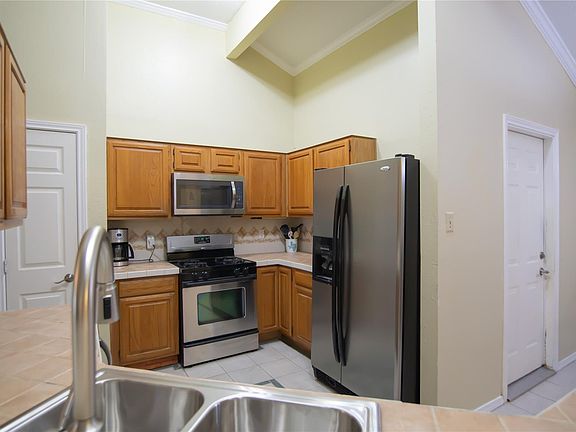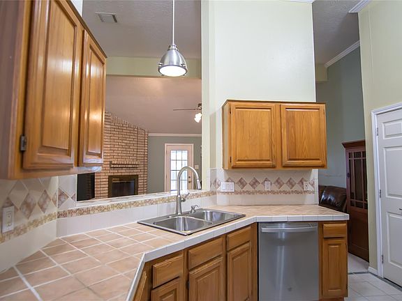 Gas fireplaceLarge covered patioInviting layoutKitchen boasts tile countertopsPrimary suiteCozy breakfast nook