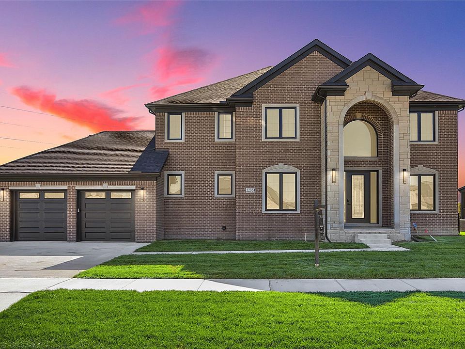 New Construction & Move In ready! Welcome to your dream home-an architecturally striking brick and stone colonial! This home isn’t just a place to live—it’s a lifestyle of elegance, comfort, and everyday convenience.From the curb, the grand stone arch entryway makes a lasting impression, complemented by sleek black-trim windows, modern dual garage doors, a wide concrete drive, and a manicured lawn that shows off the craftsmanship before you even step inside.Walk into a bright, open 2-story foyer flooded with natural light, giving you that “wow” moment the second you enter. Just off the entry, a private office offers the perfect space for work, study, or an extra room to fit your needs. At the heart of the home, the Great Room—a dramatic, elegant space designed for cozy evenings or entertaining on a grand scale. The chef’s kitchen features an oversized island, premium cabinetry, and a large walk-in pantry just steps away.Upstairs, the primary suite is a true retreat with a tray ceiling, spa-inspired bath, dual vanities, walk-in shower, soaking tub, and a spacious walk-in closet. Three additional bedrooms provide plenty of comfort for family and guests:Jack & Jill bath connects two bedrooms. Full bath serves the fourth bedroom, ideal for guests.Second-floor laundry adds modern-day convenience. Every square foot of this home was designed with purpose—from its dramatic high ceilings and elegant tray details to the open flow that makes everyday living effortless. The towering great room alone sets it apart, making this home feel both expansive and unique. Quick access to Hall Road’s shopping and dining, Partridge Creek, parks, golf, and more.