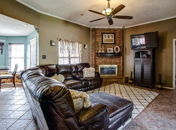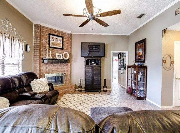 Charming & pristinely maintained 3/2/2! Designer features include crown molding, chair rails with tile insets, updated light fixtures, 2 inch blinds & hard surface flooring throughout except in bedrooms. The inviting living room showcases a corner brick fireplace with hearth & tall ceilings. You will love the light & bright kitchen with granite counters, pantry + abundant cabinet space! The spacious master suite is complete with a relaxing soaking tub, separate shower & 2 walk-in closets! Bedroom 2 includes a walk-in closet. Owner has carpet for 3rd bedroom & will install prior to closing if buyer wishes. Exterior boasts of a covered patio, a 2nd arbor covered patio, fire-pit with bench, dog run. Laundry is complete with a 2nd pantry, built-in cabinets & hanging rod. Workbench in garage stays. HURRY! This one will not last!