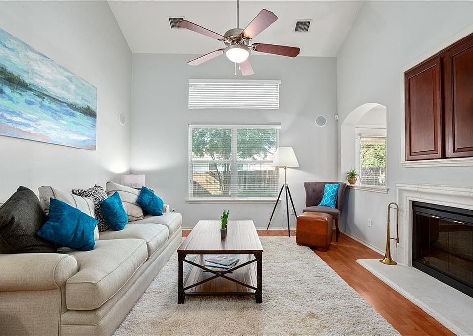 Move in ready 3 bed/2.5 bath in desired S. Austin Olympic Heights. Features a spacious living area with vaulted ceilings, updated kitchen with custom cabinetry, storage and nice breakfast area overlooking the treed backyard. Master features a walk in closet, large vanity and walk-in shower. Nice covered porch, with serene view of the shaded backyard; great for relaxing and entertaining. Recent paint and updating lighting throughout. Amazing location, great schools, with community pool and park! Must see!