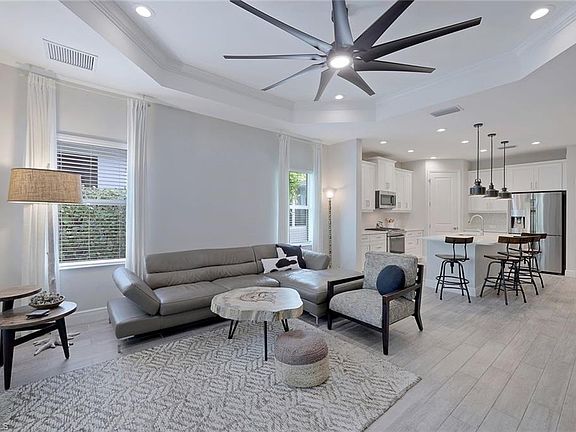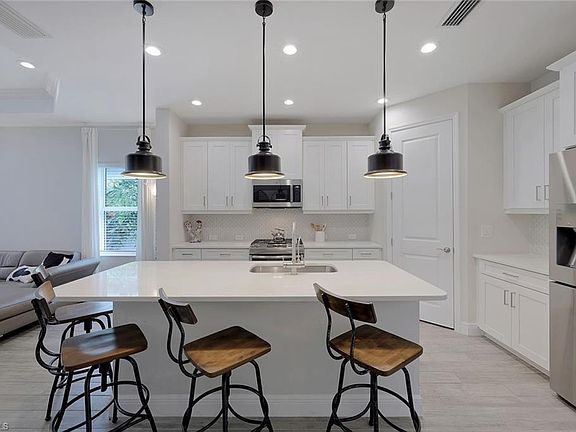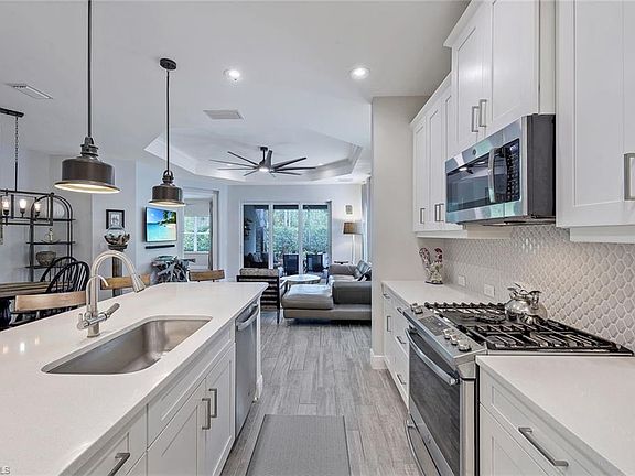 Discover the epitome of modern elegance in the Tidewinds model villa, crafted by Neal Communities in 2020. This stunning home boasts porcelain wood plank tile flooring throughout, creating a seamless flow from room to room. The well-appointed kitchen features a natural gas range and quartz countertops, perfect for culinary enthusiasts. The master bedroom offers a tranquil sanctuary with a walk-in shower and dual sinks, ensuring both luxury and convenience. Step outside onto the extended screen lanai and enjoy the serene view of the preserve, ideal for relaxation or entertaining guests. With its cute front porch, the villa exudes charm and welcoming appeal. Experience the convenience of fiber optic internet and the ease of lawn care, both included with the low HOA fees. The neighborhood itself offers a range of amenities, including a clubhouse with a pool, spa, grill, fire pit, and dog park. Located just minutes from downtown Naples and the pristine beaches, this villa presents a remarkable opportunity to embrace a sophisticated coastal lifestyle.
