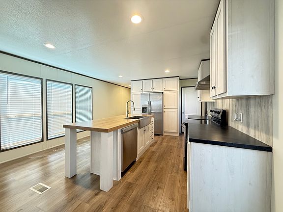 This home offers an open floor plan that creates a welcoming flow. The kitchen features an oversized island, a farmhouse sink, and generous cupboard space that opens to a large living room with custom built ins designed for easy entertaining. The laundry room provides extra storage or pantry space. The master bedroom is a private retreat with room for a king size bedroom set. The master bathroom includes a deep soaking tub with a frosted privacy window, a double vanity, and a separate shower. On the opposite end of the home are two large bedrooms, each with a closet, and a full main bathroom. Energy efficiency is built in with central air throughout. Outside, enjoy a wide green lawn, a private two car driveway, and a welcoming front deck.
