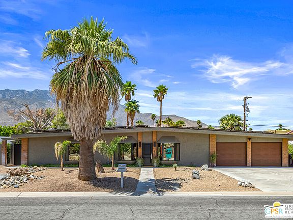 Welcome to Desert Park Estates in beautiful Palm Springs. Please view the 3D Matterport tour and Floorplan! This mid-century modified charmer is a veritable blank canvas, priced to allow your own creative vision and customizations to turn it into the home of your dreams! This property is located on a quiet street and offers gorgeous mountain views. The home forms a classic "L" shape around the serene backyard, pool and deck. A generously sized crystal blue pebble-tech swimming pool with built-in bar stools reflects a covered patio surrounded by desert landscaping, palm trees, and a large shimmering gold Buddha (Hello, The White Lotus!) to make this scene-stealing backyard retreat your private sanctuary for sun, relaxation, and entertaining! The home features 3 bedrooms, plus a study which could be a 4th bedroom and 4 bathrooms. 3 large sets of custom windows on the front of the house and 5 sets of sliders on the back allow tons of natural light, while offering beautiful views of the pool, deck, hummingbirds, and statuesque San Jacinto Mountains. (BTW - with all of the window views and the convenient grassy area in the backyard, your pets will LOVE this house!)There are master bedroom suites at opposing ends of the property, ideal for in-laws or guest quarters. The generous 2-car garage includes laundry and a bathroom. Leased rooftop solar panels. You need to see it to appreciate it! Priced to sell. Don't wait. No HOA - No Land Lease!