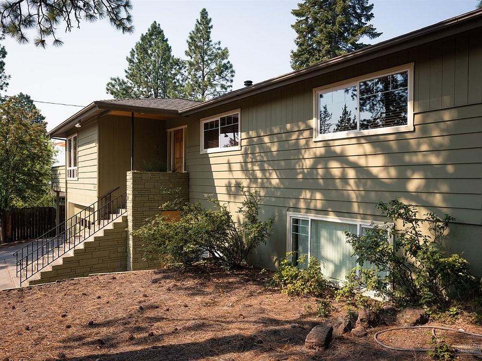 Unique mid-century, contemporary, 5bd/3ba home on a quiet dead end street in NW Bend. Walking distance to downtown, parks, river trail & schools. Views to the South & East. Large deck & garden area. Private backyard. Newly refinished hardwood floors throughout upstairs. Daylight finished basement includes family & utility rooms. 2-car garage w/carport & shop. Newer roof w/added upgrades. Furnace, hot water heater, dishwasher updated in the last 3 years. Price change due to addition of separate tax lot.