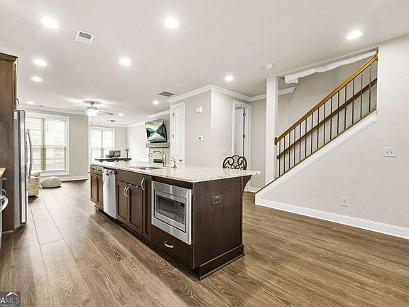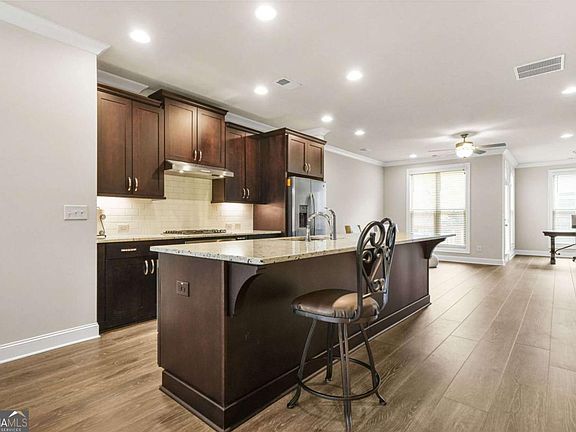 Discover this beautifully appointed 3-bedroom, 3.5-bath townhome offering the perfect balance of modern elegance and low-maintenance living. Designed with comfort and functionality in mind, this home features an open-concept floor plan, high ceilings, and thoughtfully selected finishes throughout. The gourmet kitchen serves as the heart of the home, boasting rich espresso cabinetry, granite countertops, stainless steel appliances, and a spacious island with seating, ideal for entertaining or casual dining. The kitchen opens to the bright dining area and welcoming living room, complete with a fireplace, built-in shelving, and plenty of space to relax or gather. Step outside to your private balcony, located at the back of the property, perfect for enjoying morning coffee, quiet evenings, or fresh air year-round. Upstairs, the primary suite offers a true retreat with a spa-inspired bathroom, featuring dual vanities, a large walk-in shower, and generous custom closet space. Two additional bedrooms provide flexibility for guests, a home office, or family use. Throughout the home, you'll find hardwood-style flooring, recessed lighting, and neutral tones that make it move-in ready and easy to personalize. With its modern design, low-maintenance lifestyle, and prime location near shopping, dining, and commuter routes, this townhome is the perfect place to call home.