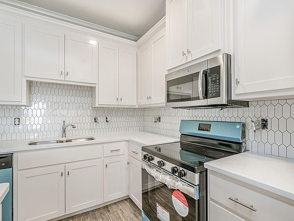 Wood-look tile flooringElegant granite countertopsLarge islandWalk-in pantryOpen-concept layout