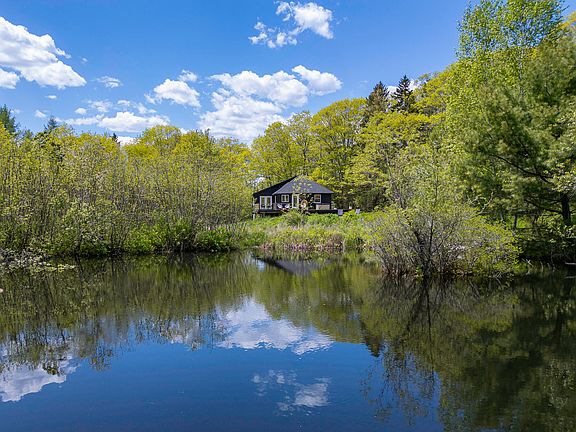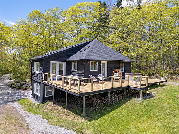 Lovingly restored, this modern home sits on 13.5 acres of lush woodland and has its own private pond. The well-designed house features a bright, open floor plan with modern kitchen and bathrooms, vaulted ceilings, and natural light. French doors lead out to the large deck with lovely pond views and plentiful outdoor seating, plus a 4-person hot tub. The lower level offers a 1-car garage and large workshop space with high ceilings and propane heat. The sunny bonus room has large windows and exterior walk-out access, providing opportunities for hobbies, home office, or even a small business. The attic provides extra storage and potential for conversion to a cozy sleeping loft. A convenient woodshed offers quick access to firewood and tools. The house exterior is clad in live-edge timber siding harvested from the property, protected by new paint and a recently installed roof and gutter system.