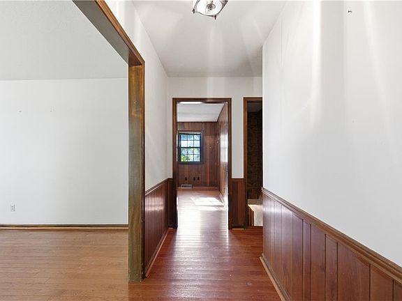 Inside, the main level offers: Three bedrooms, two bathrooms, two living spaces – a large formal living room and a cozy hearth room with a brick fireplace, formal dining room plus a kitchen with an eat-in kitchen area, beautiful hardwood floors throughout much of the main level and original charm including wood paneling, attic fan, and classic built-ins. The basement expands the living space with: Two additional bedrooms, a bathroom, a large family room with a second brick fireplace, laundry room, and access to the two-car garage.