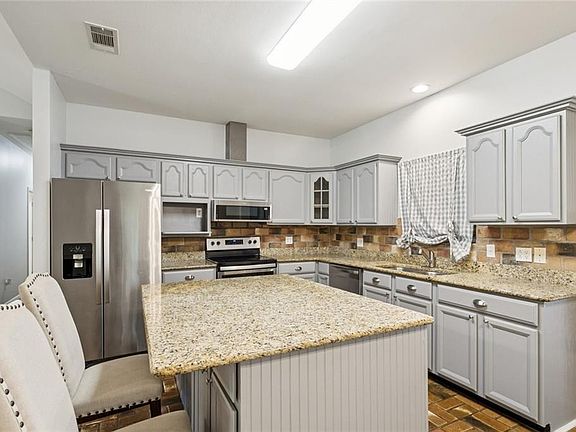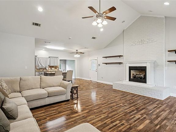 Inside, you'll find a seamless blend of brick and wood flooring throughout, adding warmth and character to every room. The spacious 21' x 16' den boasts soaring 13-foot cathedral ceilings and a cozy fireplace—perfect for cool evenings. A separate dining room features a wood-accented ceiling, brick floors, and a striking brick accent wall, with French doors that open to your private backyard oasis. <br><br>
