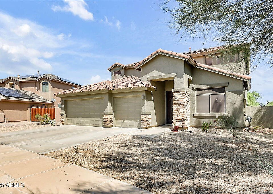Welcome to this exceptional 3,200 sq. ft. golf course residence located in Rancho El Dorado, Maricopa's exclusive golf course community, featuring completely owned solar panels, and a 3-car garage on an oversized lot. The interior has a gourmet kitchen with slab granite, stainless steel appliances, and a central island, alongside a downstairs bedroom and full bath. Upstairs, the enormous primary suite and adjacent loft both offer balcony access with stunning views of the backyard and fairways. Outside, the property has a true backyard oasis: a PebbleTec pool with a rock waterfall, a BBQ island, and extensive low-maintenance space, all situated with prime golf course frontage for the ultimate Arizona resort lifestyle.