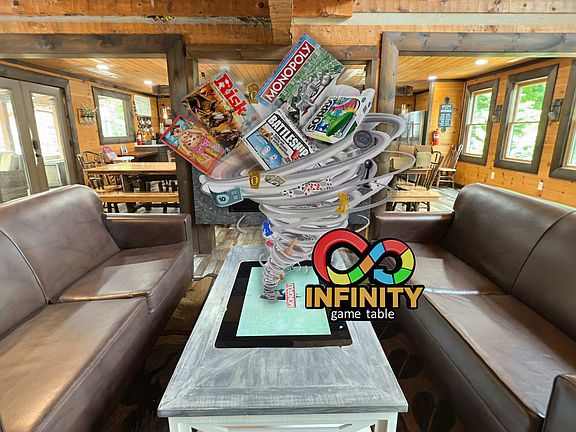 This cabin boasts an array of luxurious amenities, including an indoor heated pool for year-round enjoyment and a state-of-the-art theater room with surround sound for movie nights. The arcade wing offers vintage and modern games, including a two-player Halo game, while the pool table and hot tub provide additional entertainment options. The gourmet kitchen is equipped with extensive counter space, an oversized island, and double appliances, making it ideal for hosting large meals. The living area features a 4K TV, a gas fireplace, and ample seating, creating a perfect space for gatherings.