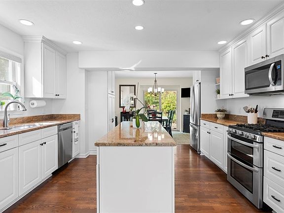 The kitchen boasts granite countertops, stainless steel appliances, and a breakfast room opening to the patio. Upstairs offers two large bedrooms, an updated bath, and ceiling fans in both bedrooms.