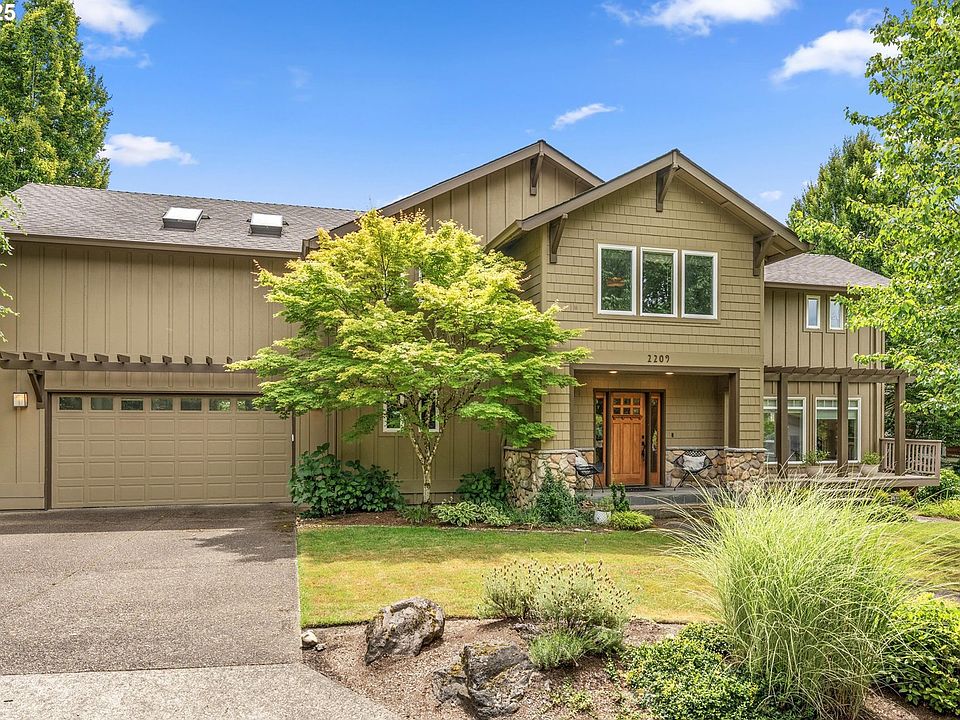 Nestled in the highly sought-after Forest Heights community of SW Portland, but within an enclave with no HOA dues, this elegant 5-bedroom, 3.5-bath Craftsman home offers the perfect blend of modern design, smart floor plan, and three levels of living. Designed with an open, flowing floor plan, this home is filled with natural light and features three expansive decks/patios with stunning south and west-facing views: ideal for relaxing or entertaining. Level lawn in both the front & back yards allow for easy childs' play! A welcoming front patio sets the tone for gracious living, while the formal living and dining rooms provide sunlit spaces for summer entertaining or gathering by the fire in the wintertime! The bright and airy kitchen opens to a generous sized family room and breakfast nook, with direct access to a sunny, private BBQ deck. The family room has a floor to ceiling river rock fireplace which grounds the room, and is surrounded by walls of windows that lets the light pour in. Upstairs, the serene primary suite boasts southerly views, a spa-like bath with dual sinks, soaking tub, walk-in shower, and a generous closet. Three additional spacious bedrooms and a dedicated home office complete the upper level. The lower level offers a large bonus/flex room with a full bar, wine cellar, and walkout access to a level lawn. This home has an incredible amount of clean, dry storage throughout, so everything hs its own place. Enjoy the Forest Heights lifestyle with top-rated schools, walking paths, public parks, scenic trails, and a quaint town center, all just minutes from Nike, Intel, OHSU, and downtown Portland. Welcome home! [Home Energy Score = 3. HES Report at https://rpt.greenbuildingregistry.com/hes/OR10126038]