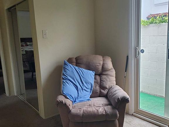 PRIVATE furnished Bedroom & private full bathroom with private entrance, and private patio area for rent. Includes full size bed, recliner chair, and small table with 2 chairs. Also small refrigerator and microwave. Bed has built in drawers underneath, chest of drawers and large closet for storage. One off street parking space included. Minimum 90 days stay. credit check required, utilities included, no loud music, 90 days lease required, can continue month to month.