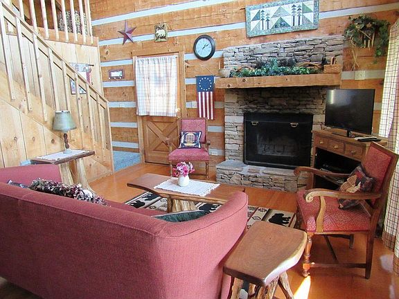 So many features with this two bedroom two bath cabin home with a million dollar view! The home has been tastefully remodeled with no detail left untouched. The main level has one bedroom and one full bath with an open concept living room and kitchen area. The living room features a beautiful stone wood burning fireplace and views of the Smoky Mountains from most rooms. The kitchen is open with a dining area with newly purchase Amish dining table and chairs ($2000). The upper level features a loft bedroom with full bath along with an owner closet. The picture windows show the gorgeous views of the mountains as you enjoy the game room area with pool table. The covered deck with the new hot tub makes this the perfect first or second home, vacation getaway or rental cabin. Wood carvings