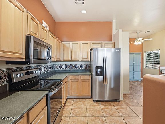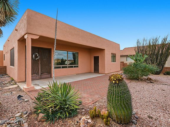 Discover easy southern AZ living in this updated Santa Fe style home with the largest floor plan (1,579 sq. ft.) in the popular, gated subdivision of The Legends. This 2 bedroom, 2 bath layout includes a den/office, 2 car garage, and a spacious Great Room with a gas beehive fireplace for those chilly winter mornings! And there are ceiling fans in every room to keep you cool in the summer. The open kitchen is accented with peeled wooden poles and corbels and features lots of maple cabinets and countertop space with large island. Enjoy the SE mountain view in back from the covered patio and the enclosed front courtyard which is perfect for the desert sunsets. There's a 2 car garage, a flat roof for easy maintenance, and no carpet. Plus, there's a private neighborhood pool!